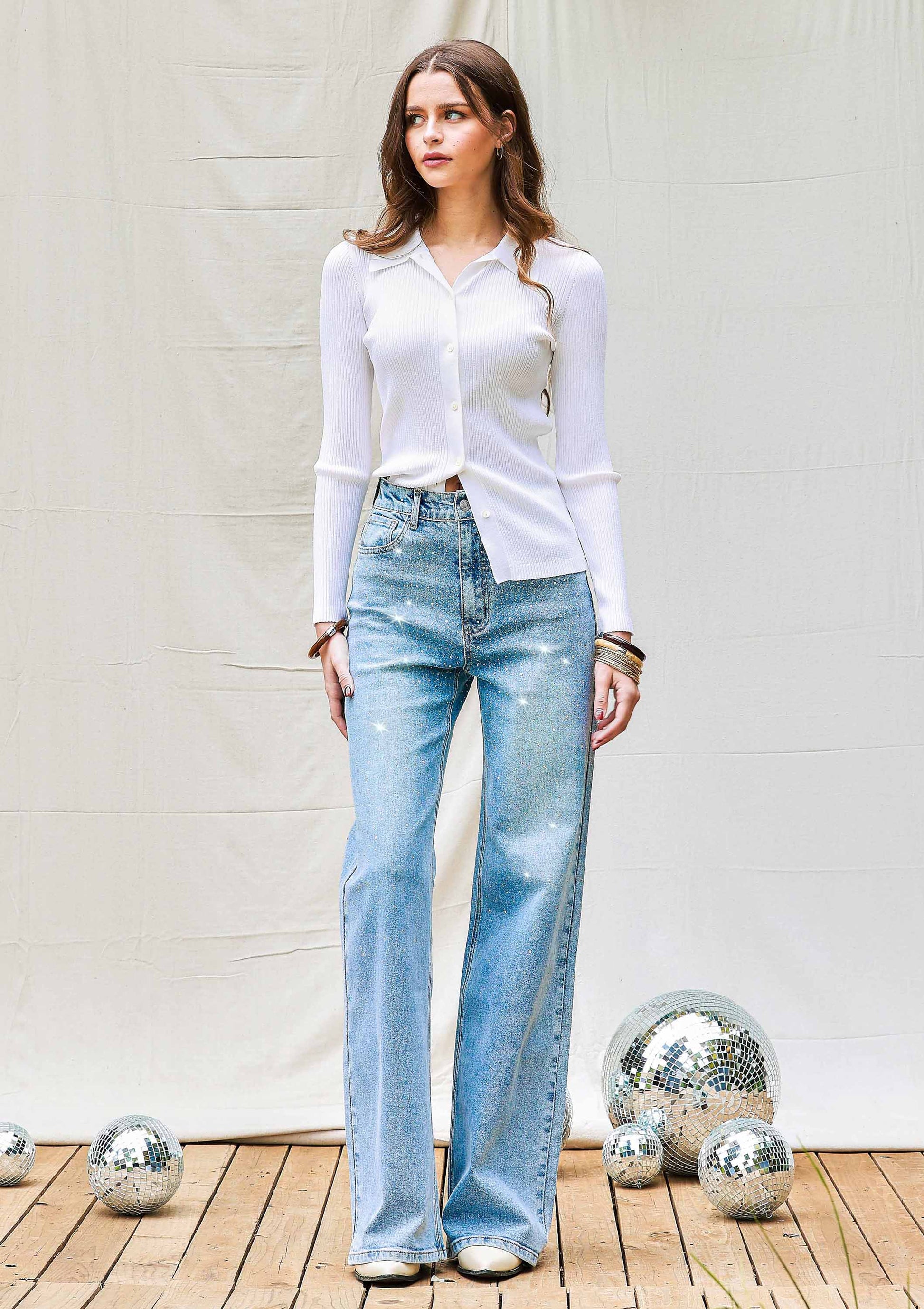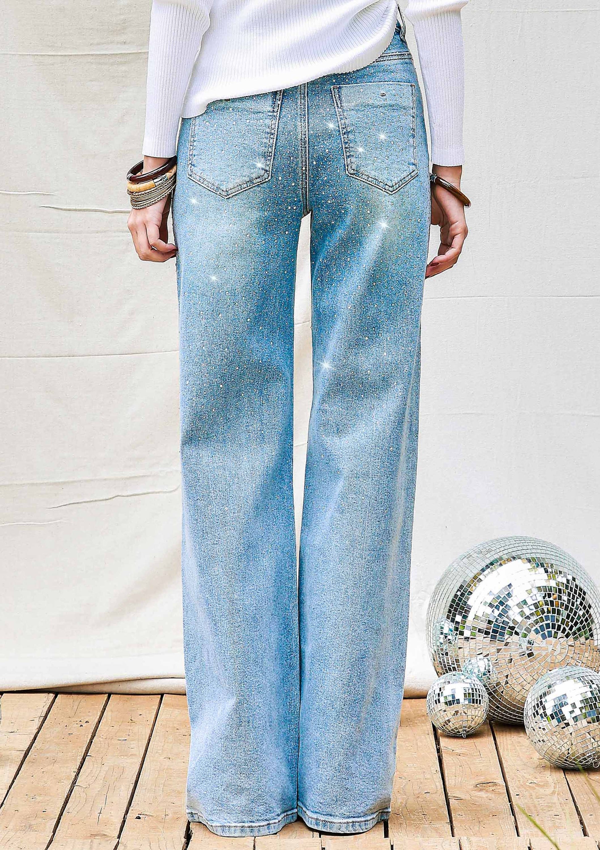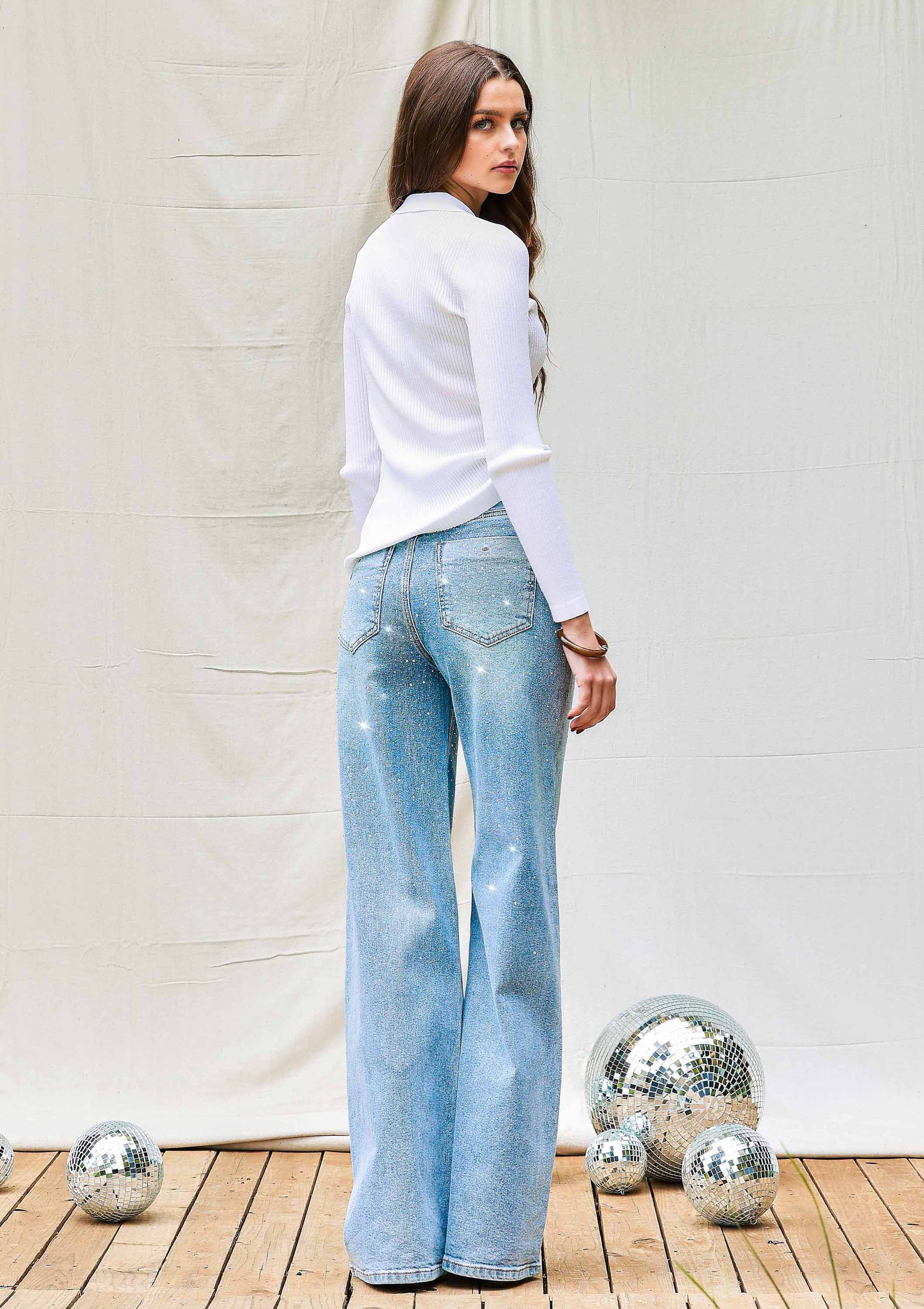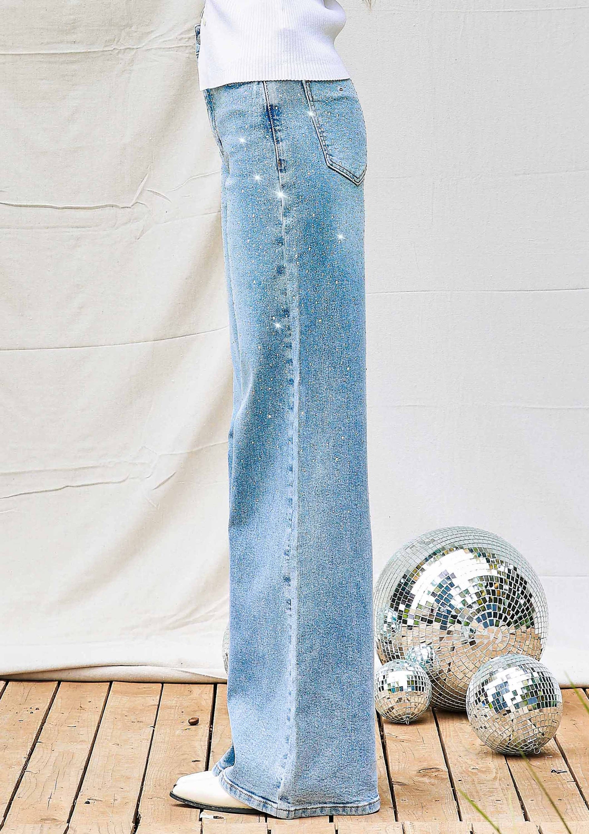A pair of high-rise wide leg jeans featuring all over iridescent rhinestone, a classic 5-pocket construction and a zip-fly closure. (3) Rise: 12", Inseam: 33" Model is 5'8" and wearing a size 3 *MACHINE WASH COLD