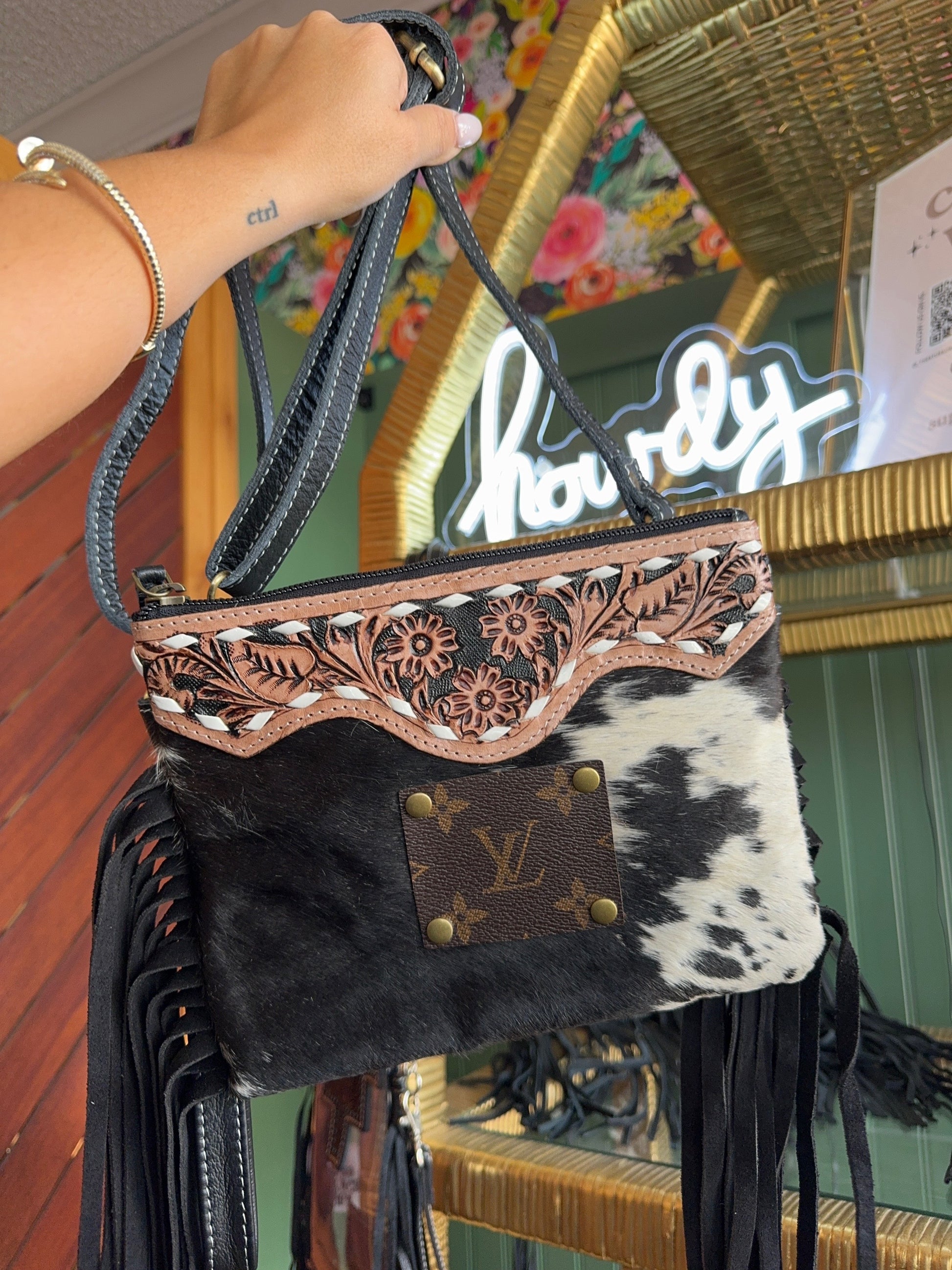 A one-of-a-kind piece blending genuine cowhide, tooled leather, and fringe for that perfect western edge. Wear it crossbody for everyday or as a wristlet for a night out—either way, she’s the statement bag you’ll reach for every time.