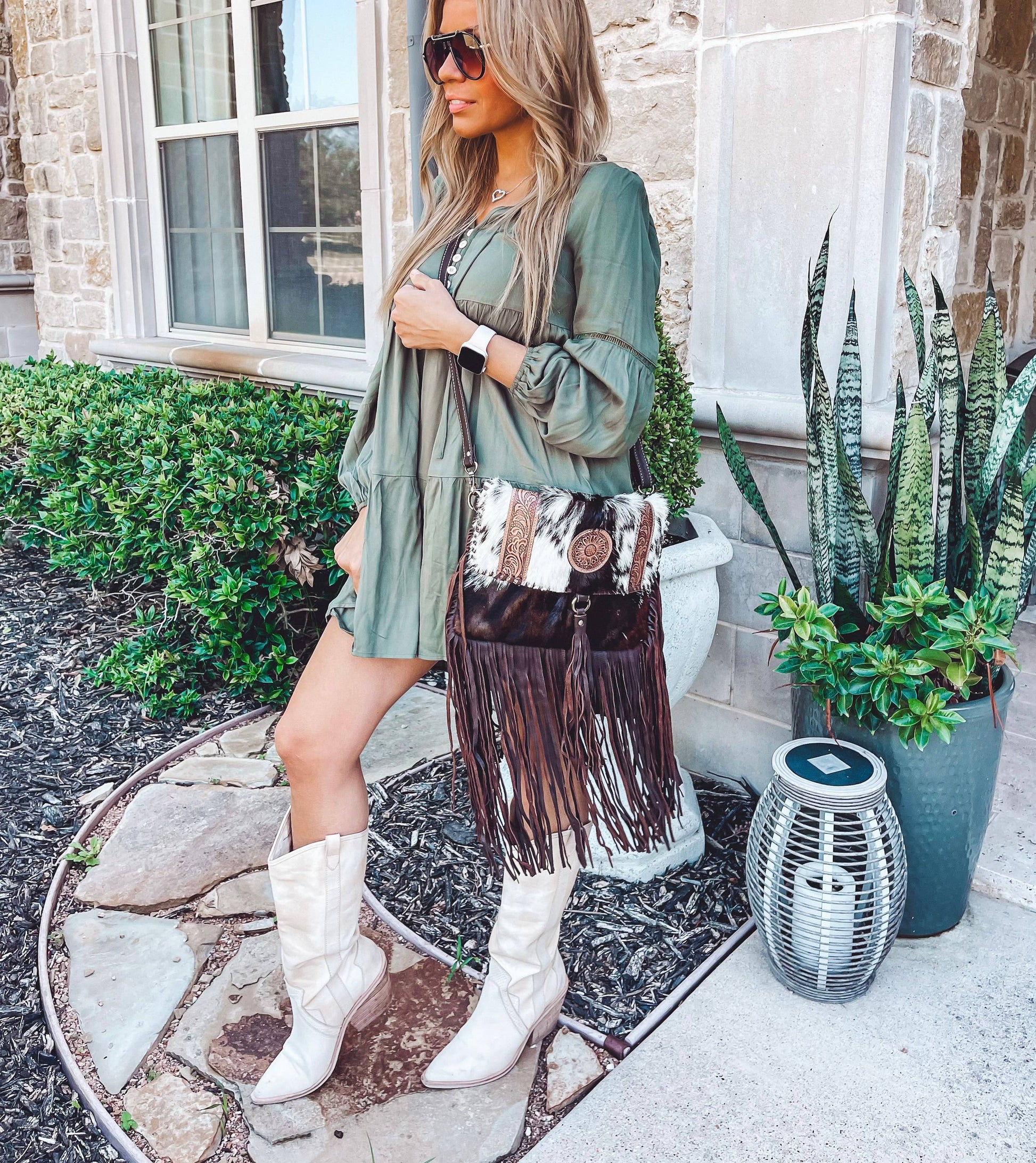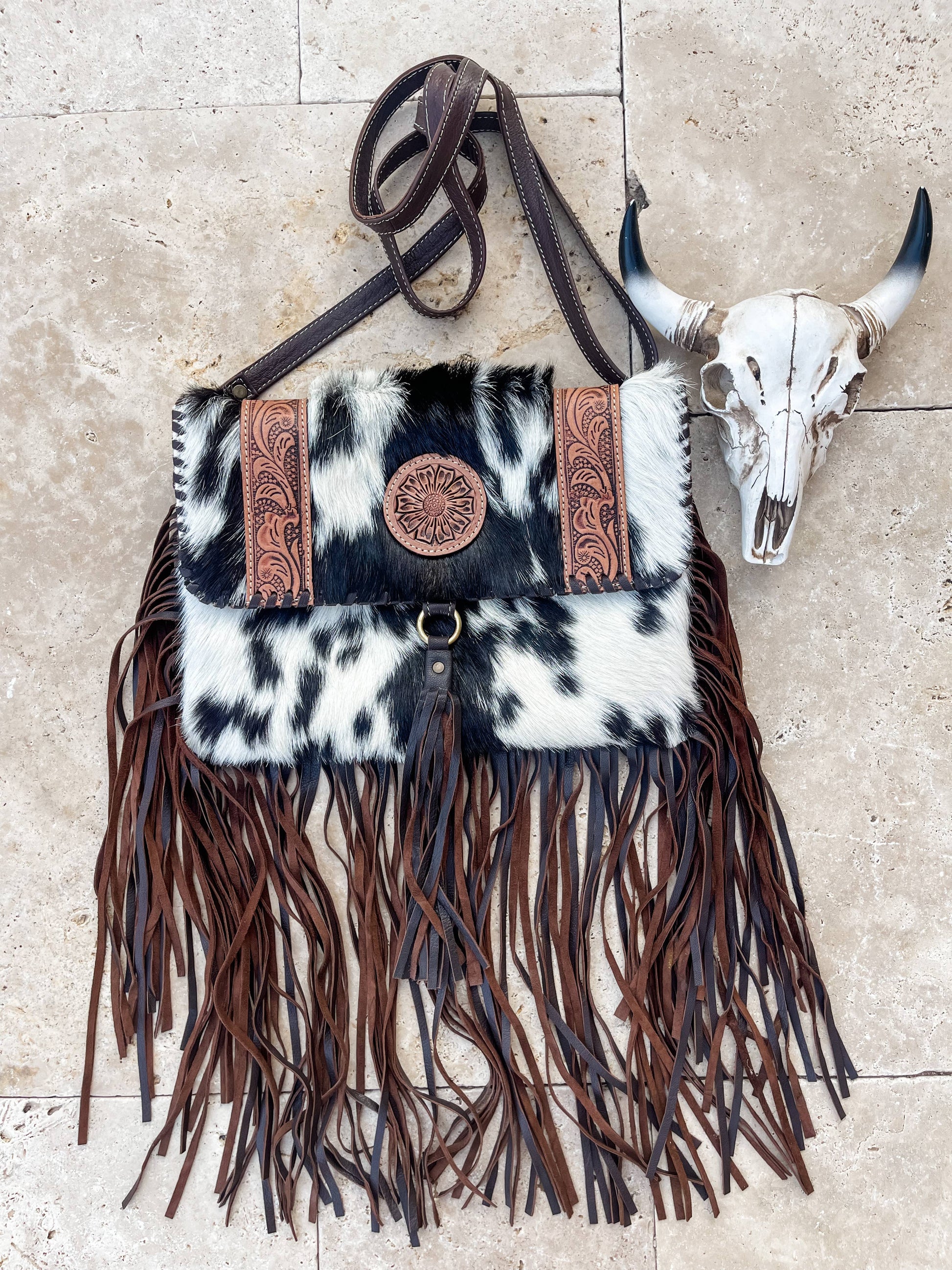 This purse is GORGEOUS! It’s the perfect size! This purse can be used: Clutch Handbag Crossbody Shoulder Bag 100% genuine leather 100% genuine cowhide Main compartment holds your keys, wallet, phone, makeup bag, etc. Magnetic closure Inside zippered pocket Fabric inside lining strap is adjustable Strap is removable to use as a handbag/clutch back of the purse is all leather Genuine Leather Fringe 12” x 9” x 1.5” Choose your leather color and we will send you one from that group. Every purse is one of a kind. Please note that this is real cowhide and leather and there can be small defects. Know that I take pride in using the best picked for handbags. XOXO